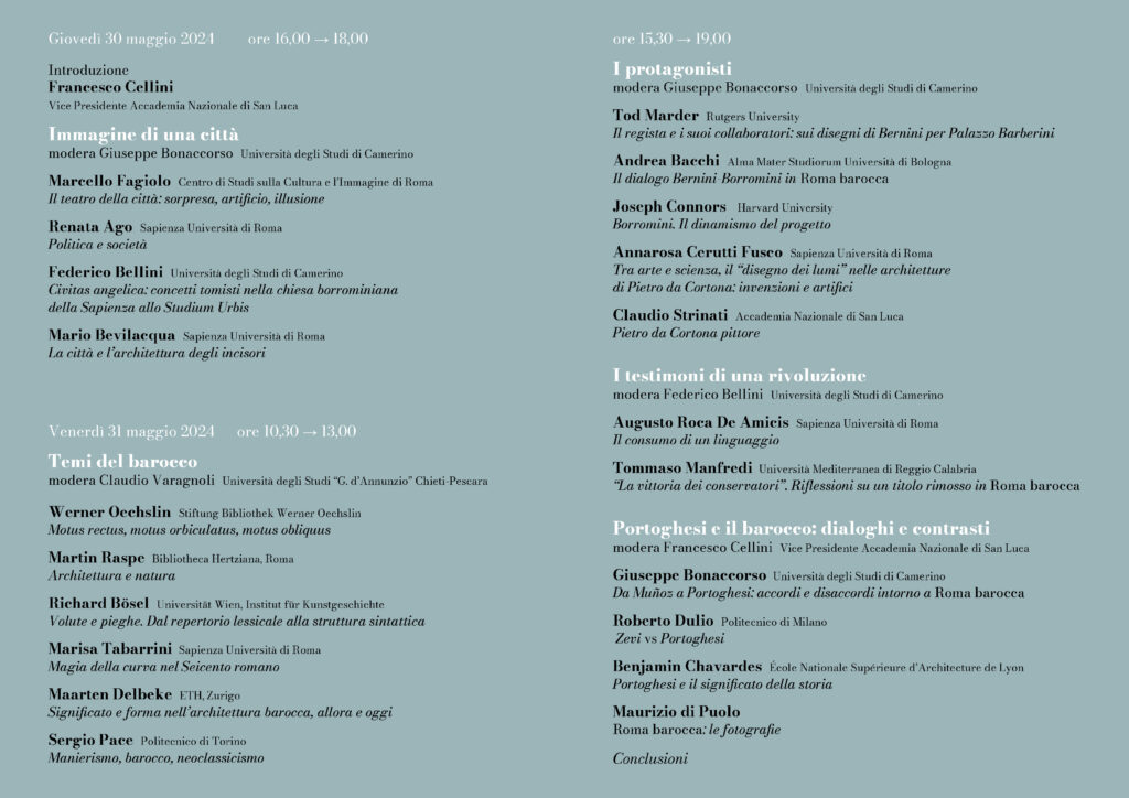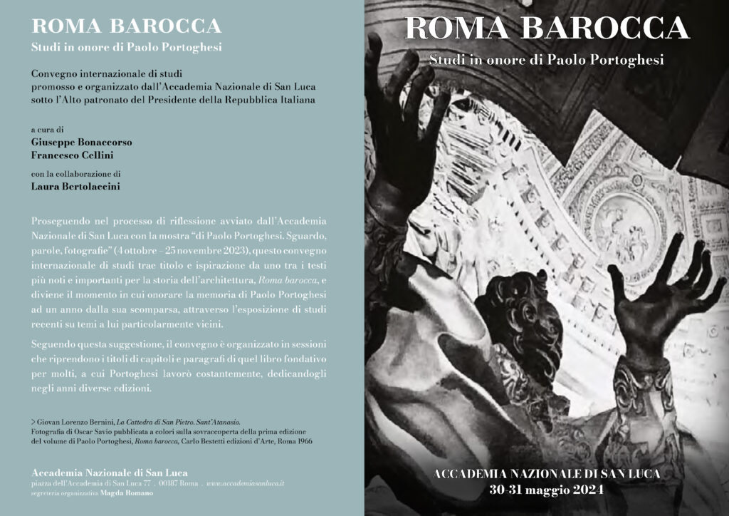 Roma, Accademia di San Luca, Piazza dell’Accademia di San Luca, 77 – Roma. Giovedì 30 maggio e Venerdì 31 maggio 2024 – Convegno internazionale di studi ROMA BAROCCA in onore di PAOLO PORTOGHESI
